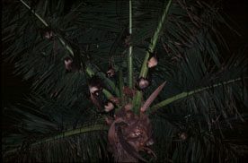 オオコウモリは超音波の反響でものを見るわけではないので、優秀な目をもっています。しかし、ほんとうに真っ暗な世界では見ることができません。だから月や星の明るい夜や人家の明かりの近くが好きです。昼間も洞窟には入らず屋外で木にぶら下がって寝ています。昼間飛ぶこともあります。