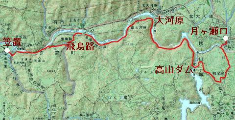 右方向に降り、広い車道となり笹瀬橋を渡り左折。茶畑を見ながら緩やかな登りの坂道を右に右に回りこみながら進むと登り切った所に南山城少年自然の家や総合グランドがあり、少し降りはじめると目の前に迫力ある高山ダムが見えてくる。