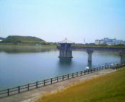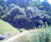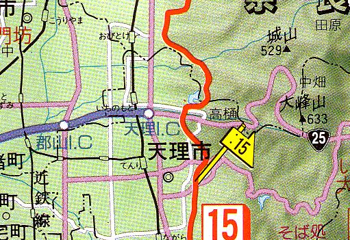 白川湖を離れ高架道路の下を潜ると目の前に名阪道路の高架道路が見えた。ガイドブックや他のHPでの案内ではこの名阪道路沿いをしばらく並行して歩くと案内しておられたが、すんなりと回り道をしないで道標にしたがい潜り抜けてしまう。 名阪からは、山側にはいるように進み、でかい貯水タンクの横から竹林の山道に入る。 竹林に入ると照りつける陽射しが遮られ涼しくなった。鳥の鳴き声の中、遠くの方で鶏の鳴き声が聞こえてきたと思ったら、養鶏場の横をと売り抜ける。やがて果物畑に出、ベンチで昼食を取る。 田園の細い道は、やがて天理市に向かう幹線道路に出て道路沿いに街中に入っていく。立派な天理教の宿舎が立ち並びだした。