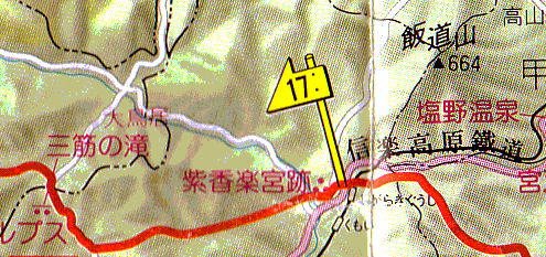 神慈秀明会バス停←三筋の滝←1.6k(20分)田代←6.7k(120分)黄瀬←0.8k(20分)紫香楽宮跡駅 合計2時間40分