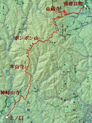 阪急高槻駅10:30→神峰山口バス停10.45→神峰山寺11.30→本山寺13.00→ポンポン山山頂14.20→杉谷15.00→金蔵寺16.30→長峰バス停17.00