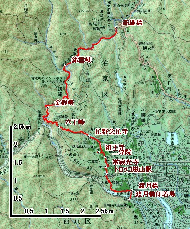 京都市バスJ嵐山バス停10:00→鳥居本10、45→保津峡・落合11.30→清滝1.00→高雄2.45→高雄バス停3.00