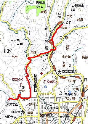 鷹峯源光庵前バス停11.00→西方寺11.45→高端0.20→大岩1.30→夜泣峠2.30→二ノ瀬踏切3.00→鞍馬4.00→鞍馬温泉5.30→叡山電鉄鞍馬駅5.35