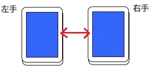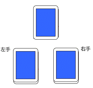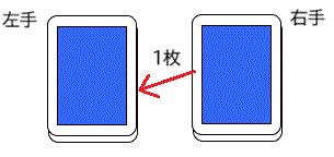 相手が覚えている間に、右手の一番上のカードを左手の束の下に回し、さらに左右を持ち替えます。
