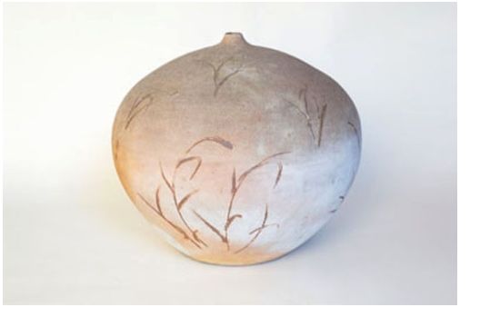 Left: "Cloth Texturing, Autumn Grass Pattern Vase," (w)39.0 -(d)39.0 -(h)34.0 cm, stoneware and slip painting, wood fired and charcoal smoked, traditional way fired to 1250 degrees C., eight-day firing. Exhibited at Traditional Crafts New Exhibition, Nihon Kogeikai, Tokyo, Japan, 1989.