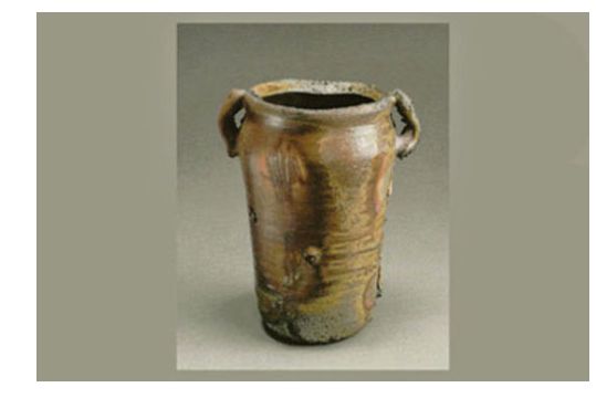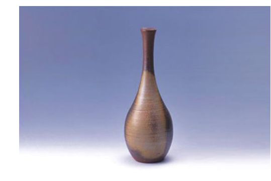 Right: "Bizen-style Long-necked Ovoid Pottery Vase," (w)17.5.0 -(d)17.5 -(h)46.0 cm, wood-fired stoneware with natural wood ash, Bizen traditional way fired to 1250 degrees C., eight-day firing. Exhibited at Leigh Gallery, London, June 15-27, 1993. Collection of The British Museum (U.K.), 1996.