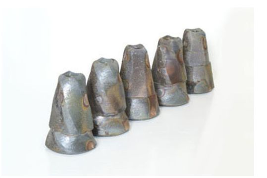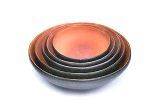 Right: "Bowls in Sets of Five ("Ireko")," smallest (w)17.7 -(d)17.7 -(h)5.5 cm, largest (w)31.3-(d)31.3 -(h)8.5 cm, wheel-thrown and stoneware, salt-water sprayed interior, black slip exterior, bottom upward when stacking kiln, traditional way fired to 1250 degrees C. oxidation, eight-day firing. Published in 500 Bowls: Contemporary Explorations of a Timeless Design, Lark Books, A Division of Sterling Publishing Co., Inc.,New York, U.S.A., 2003.