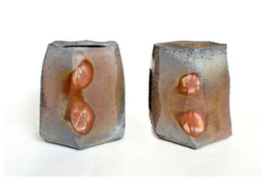 Left: "Vessel: Otherness," (w)58.0 -(d)16.5 -(h)18.5 cm, wheel-thrown and altered stoneware, with natural glaze, fire change, traditional way fired to 1250 degrees C. reduction, eight-day firing, 2nd International Ceramic Triennial UNICUM. Exhibited at European Cultural and Technological Center Maribor (EKTC), Manor Betnava, Slovenia, May 15- September 30, 2012.