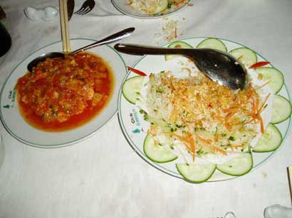 ・エビチリ(左)と手を付けたチラシ寿司「タップカム」(右)とのベトナム版。魚を揚げた天カスが美味しい。