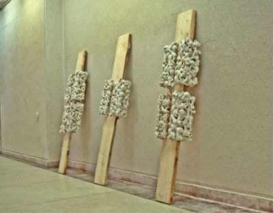 Stoneware (unglazed with slip), wood elements, sprayed salt solution.