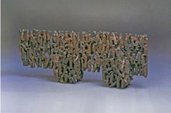 “Relation” ― A cloth bag filled with sand placed in a crisscross arrangement over a plaster cylinder. These works, composed of plaster, wood, cloth, and sand,